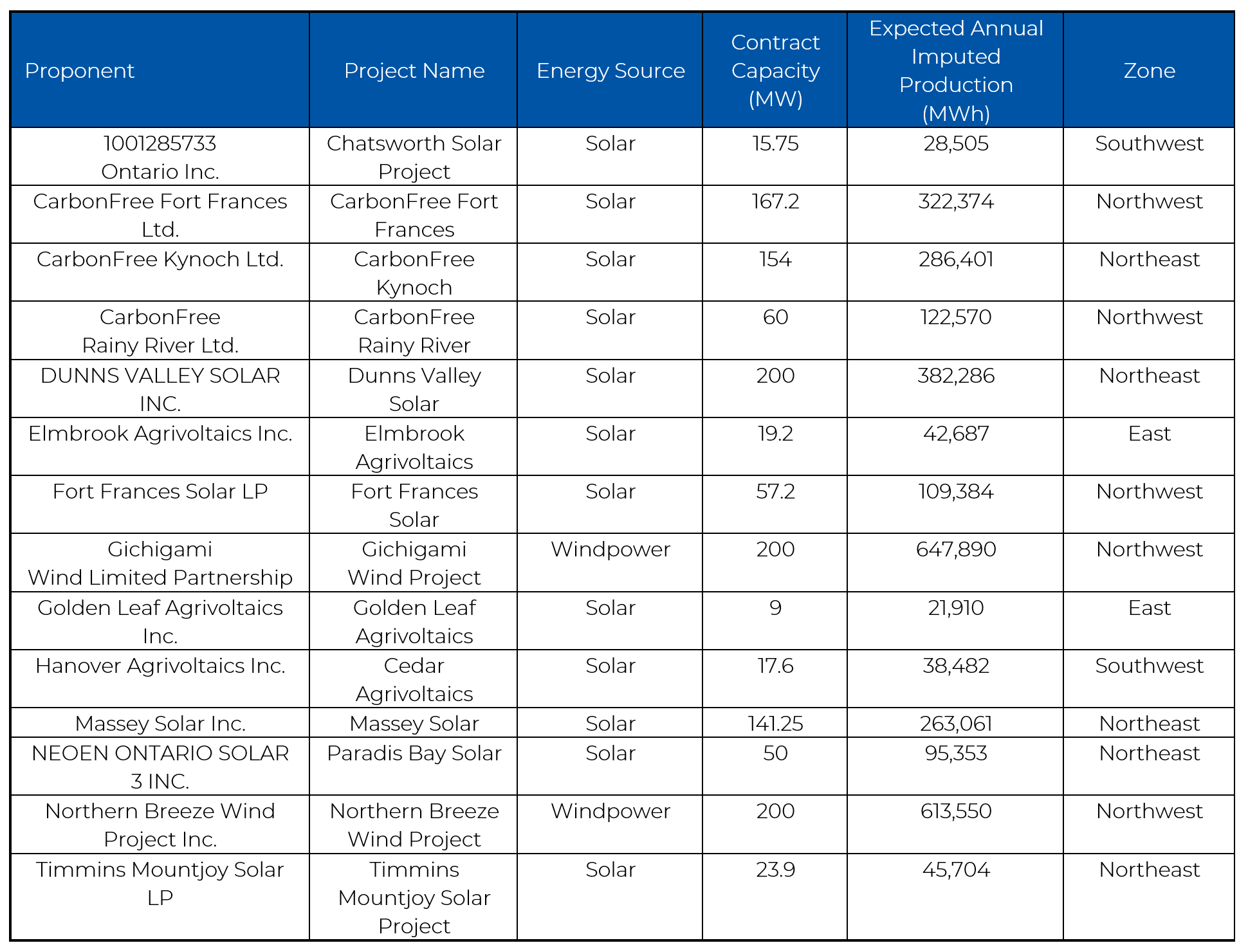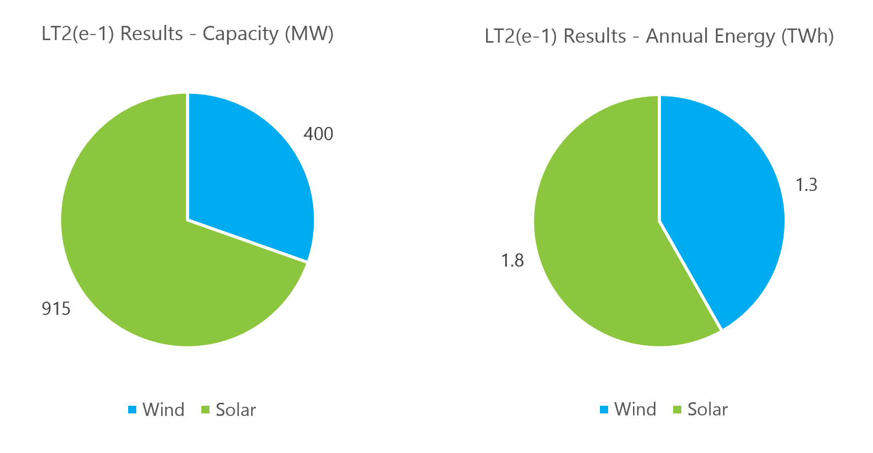 The Independent Electricity System Operator (IESO) released initial results from the Long-Term 2 energy stream window 1 (LT2(e-1) - 1,315 MW of wind and solar resources. Wind power accounted for 400 MW procured, while solar resources accounted for 915 MW – or 30% and 70%, respectively, of total capacity procured. On an annual energy basis, the procurement will provide ~3 TWh of annual energy – roughly the target capacity in the procurement – when all of the projects are operational. The split between the two resources procured on an annual energy basis is closer at ~1.3 TWh for wind and ~1.8 TWh for solar, a 40% and 60% split respectively.The weighted average price of the contracts is $87.80/MWh.