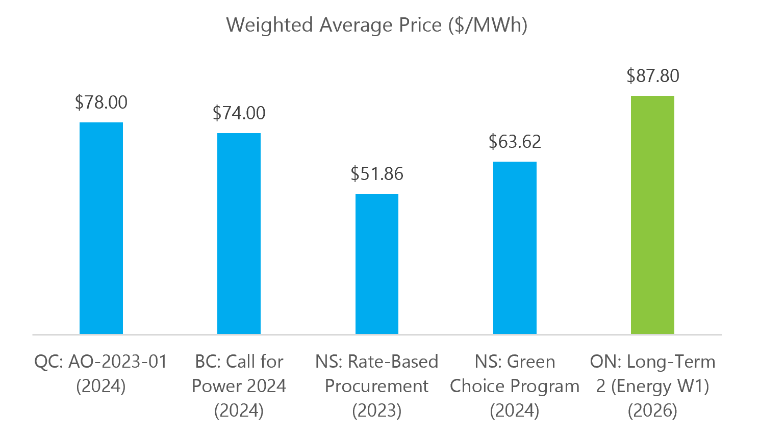 3. Energy Price Comparison – the weighted average price of $87/MWh – which includes the Investment Tax Credit – is higher than recent procurements across Canada for renewables (see chart below). The higher price could be explained by challenges outside of the control of proponents and the IESO (e.g., global trade tensions, geopolitical risks) but consideration should be given to the siting restrictions, municipal support resolution requirements, deliverability threshold, and compensation approach of the LT2(e-1) RFP and contract. Each aspect would influence proponent risk-analysis and ultimately bid price. We note that the weighted average price reported by the IESO is close to the lower end of the range of prices we developed based on our own internal modelling last fall.