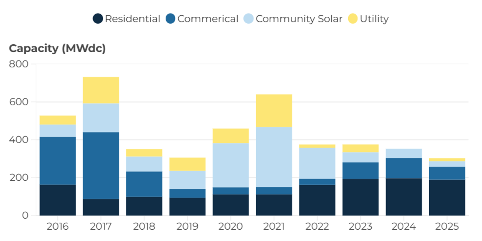 Assuming that the 4 GW of solar is added from now through 2035, that would amount to 400 MW per year, a continuation of the market size over the past 10 years. In recent years, the residential market has accounted for the largest part of installations. The new bill would support all project categories.