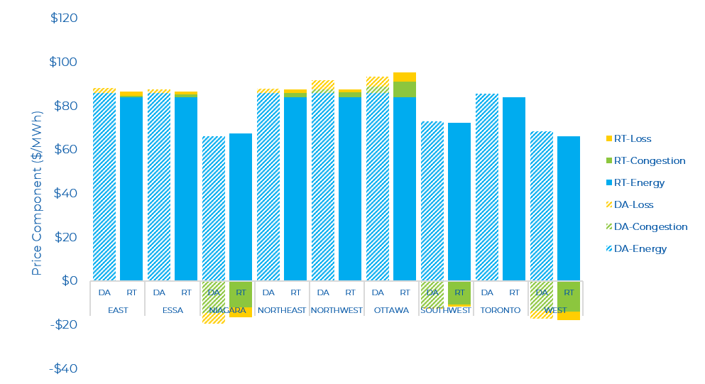 For the month of November, the average Day-Ahead (DA) zonal prices ranged from $77/MWh (Niagara) to $93/MWh (Ottawa), while Real-Time (RT) zonal prices ranged between $48/MWh (West) to $95/MWh (Ottawa). There were a few notable changes in pricing across the IAM in November. First, the Ottawa zone was the highest priced zone in both the DA and RT markets. The primary driver of high prices in the Ottawa zone was reduced capacity on a major transmission line, which can limit supply into the zone. Second, there was considerable negative congestion across the Niagara, Southwest and West zones.