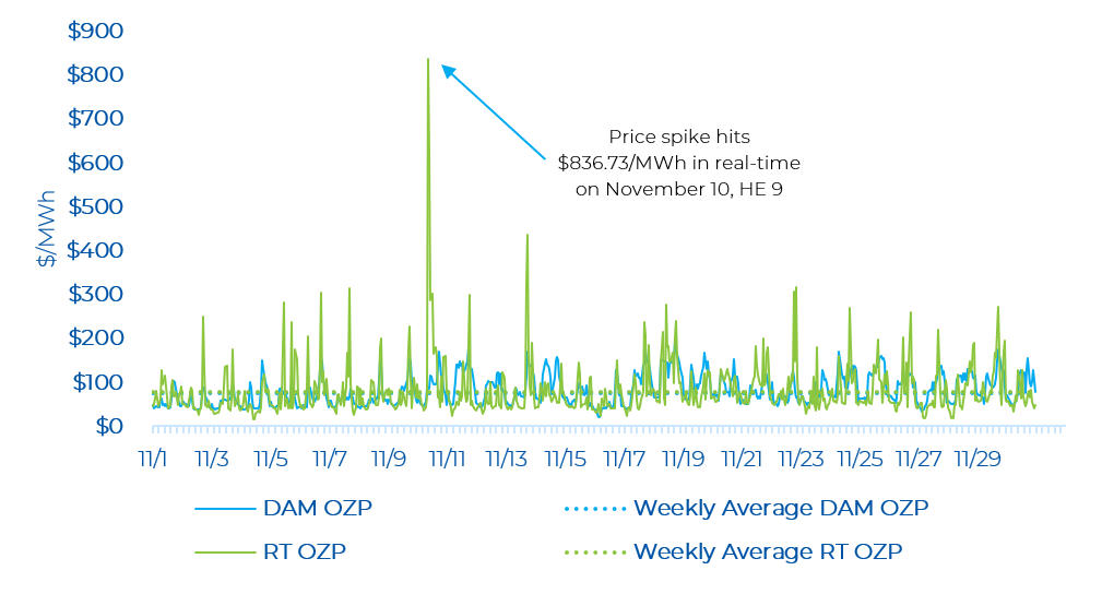 Real-time zonal prices in the Northwest zone remain volatile – with the Northwest seeing swings from negative to positive congestion, although the positive congestion tends to be higher in magnitude. The Northwest saw a high of $330.27/MWh (on November 10, HE 20) and low of -$147.18/MWh (on November 21, HE 18). On the other hand, the Northeast zone saw a couple of hours of positive congestion, with a high of $329.32/MWh (also on November 10, HE 20 like the Northwest zone).