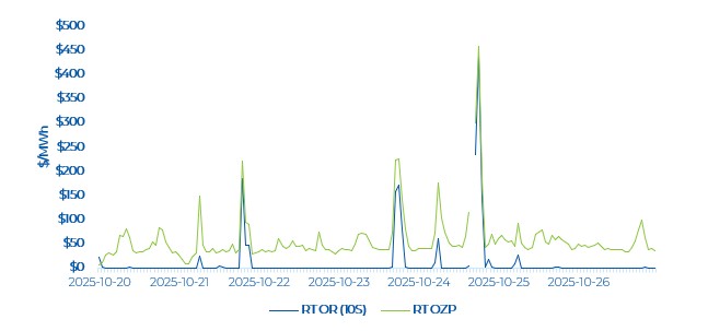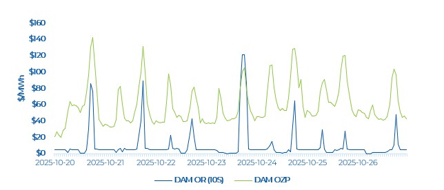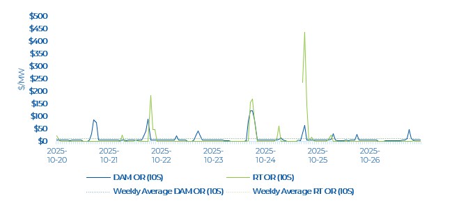 Real-time OR prices exhibited less volatility compared to energy prices. The highest real-time OR price was $435.66/MWh, also at the same hour as the peak real-time OZP last week (October24, HE 19).