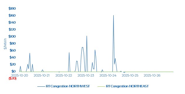 In the real-time, there were several hours of positive congestion for the Northwest zone with a high of $160.59/MWh (on October 24, HE 7). The Northeast zone saw a single hour of minor positive congestion.