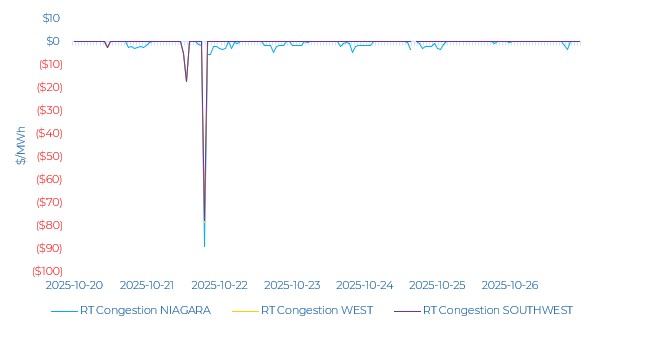 Last week, congestion in day-ahead was observed in the Niagara, Northwest, Northeast, Southwest, and West zones. The Northwest zone saw the most congestion with a high of $118.05/MWh (on October 22, HE 23). Congestion in the Southwest and West zones was nearly identical, with a low of about -$46/MWh (on October 21, HE 19). The Niagara zone saw negative congestion with a low of -$57.43/MWh (on October 20, HE 18). The Northeast zone observed minor positive congestion (i.e. up to about $5/MWh).