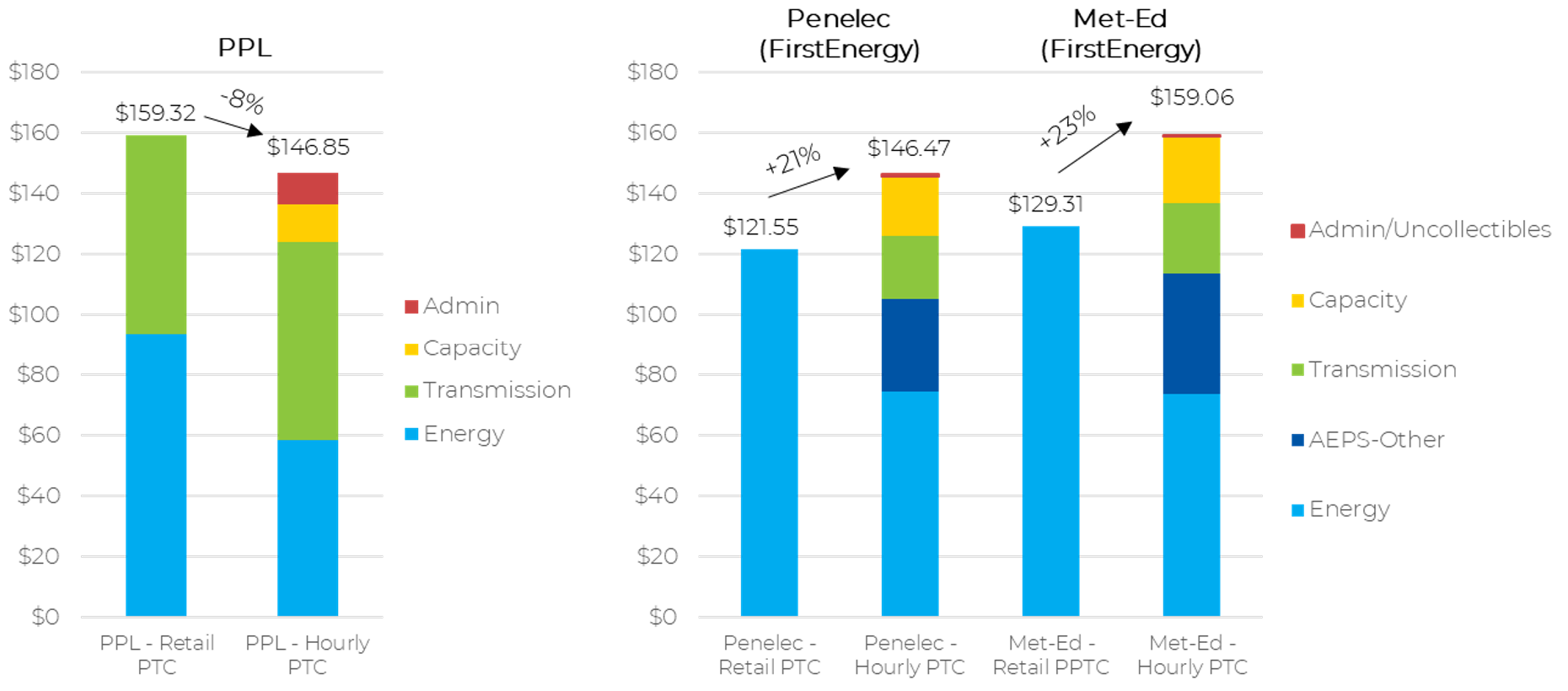 Note: Some charges have not been filed in a proposed or effective tariff and thus are estimates by Power Advisory. This included PPL’s capacity charge and FirstEnergy’s Transmission charge. In addition, Power Advisory splits the established FirstEnergy Cap-AEPS-Other charge into a capacity value and AEPS-Other value.