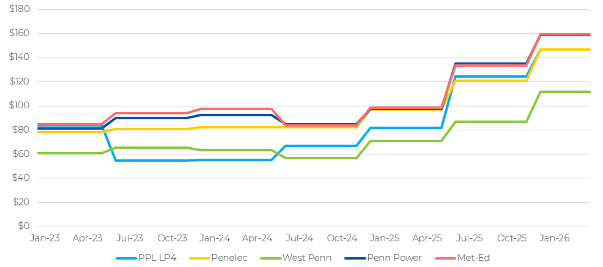 With the transition from retail to hourly-based PTC rates, market participants have turned their attention to the hourly-based value stacks. And the news is not bad. On the PPL side, the hourly-based value stack has taken a modest 8% haircut (for April 2026), but FirstEnergy utilities have actually increased in value (see Figure 2 for April 2026 value stacks). In terms of the FirstEnergy companies, Penelec’s hourly-based PTC is 21% higher than the retail PTC, and Met-Ed is 23% higher.