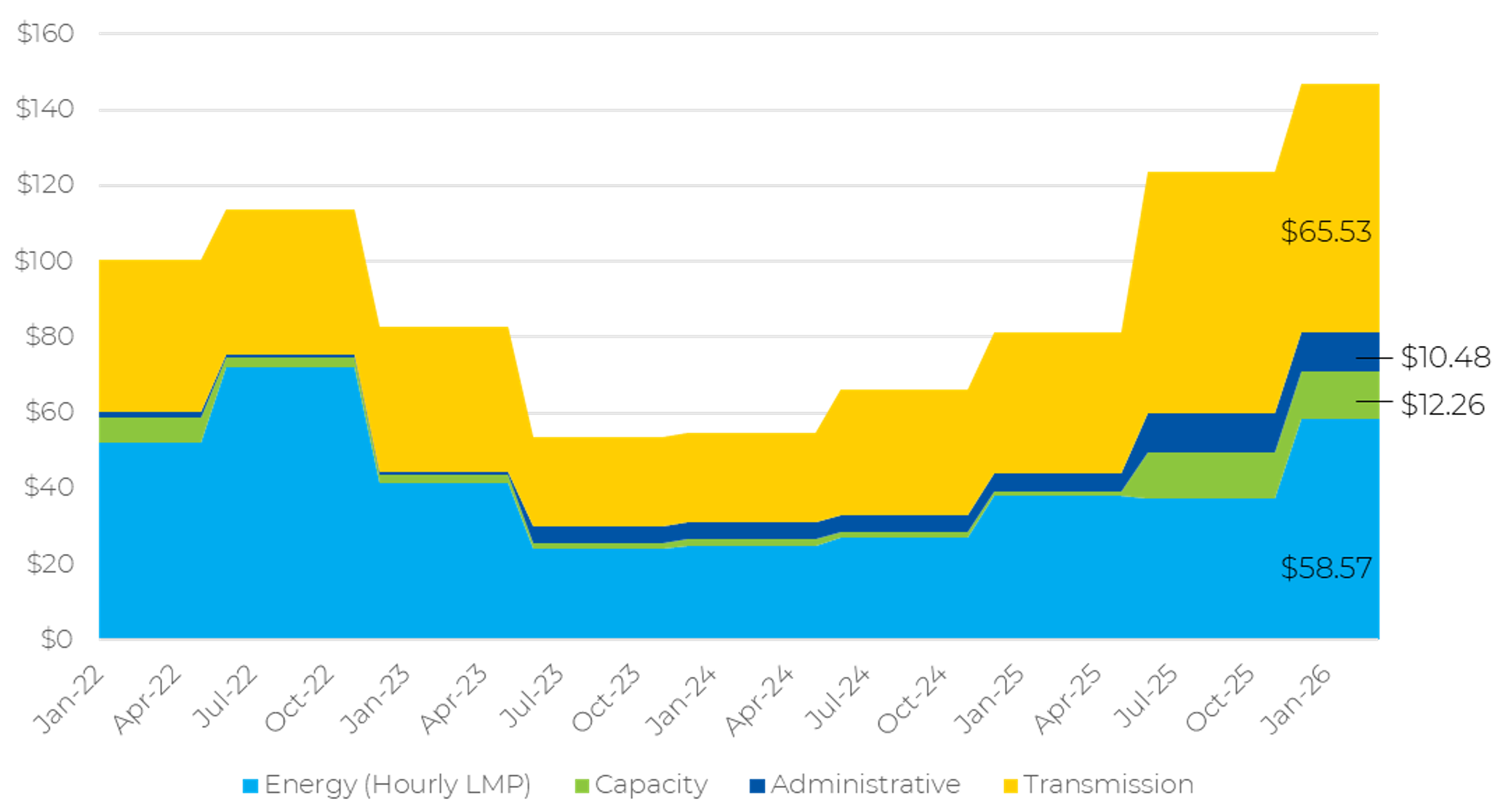Figure 4 shows the breakdown of rate components for PPL. As can be seen, for the current month (April 2026), the transmission charge is the highest charge, followed by the hourly LMP. The capacity charge is third, and administrative charge, fourth. While these last two charges are much smaller than the first two, they have nonetheless increased materially in the recent past.
